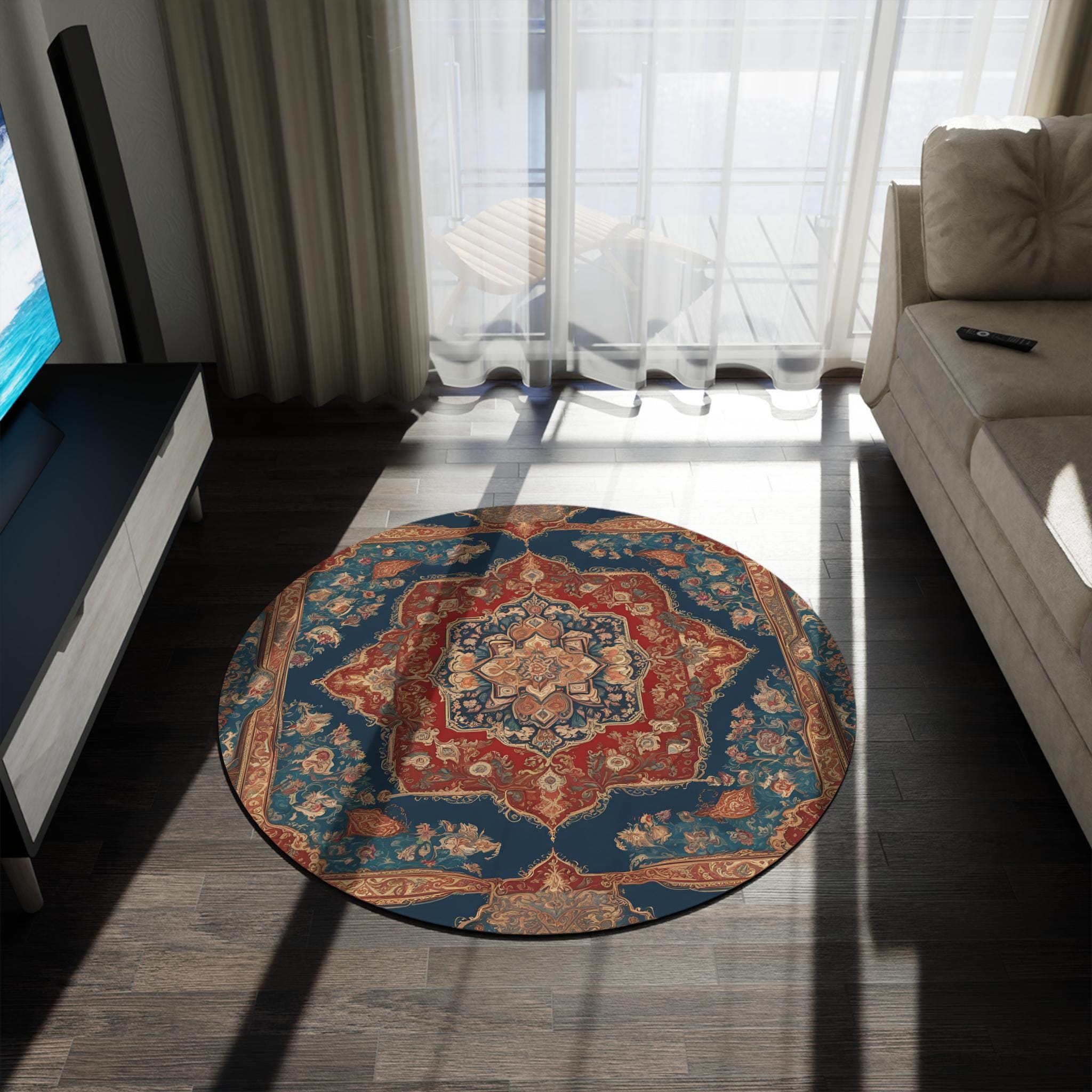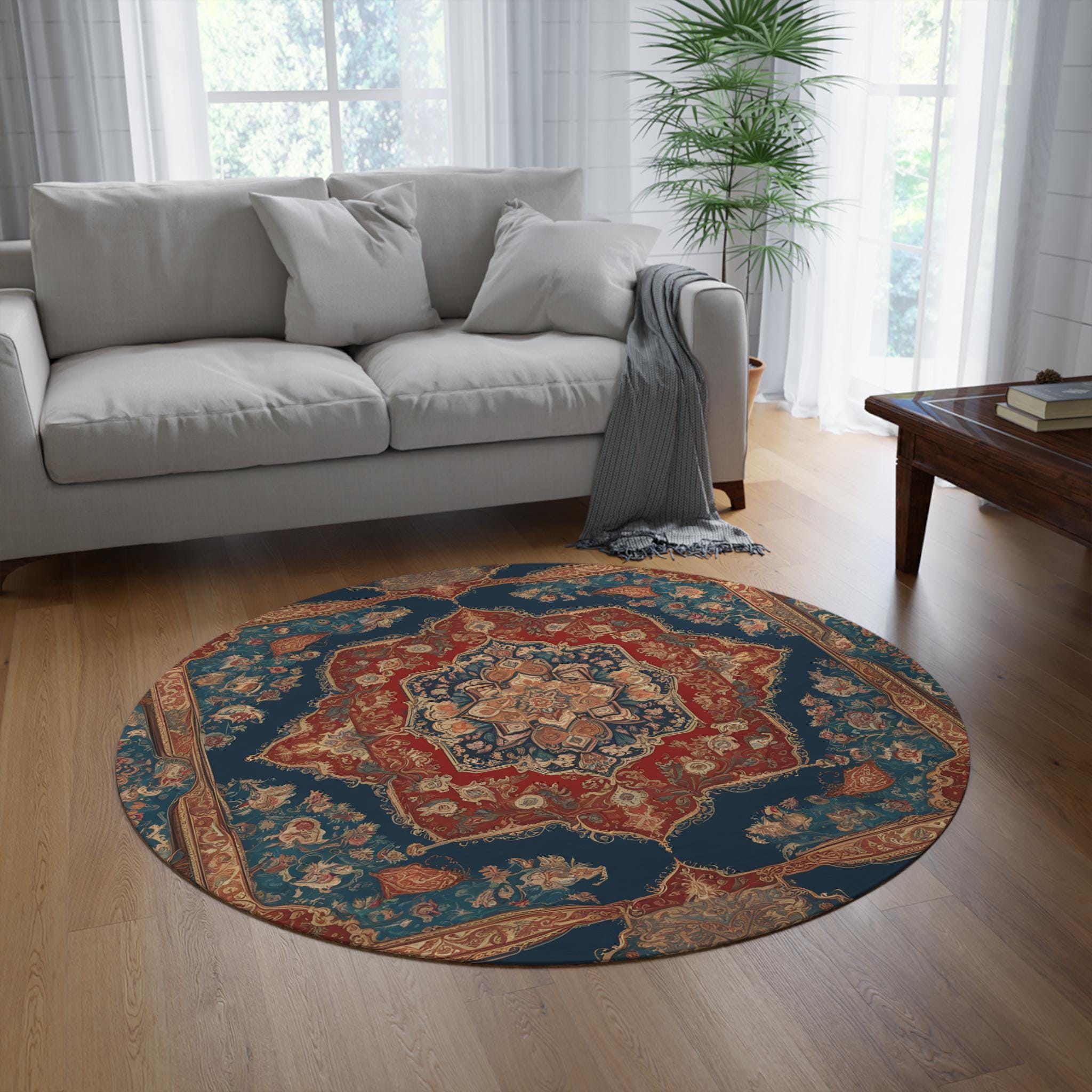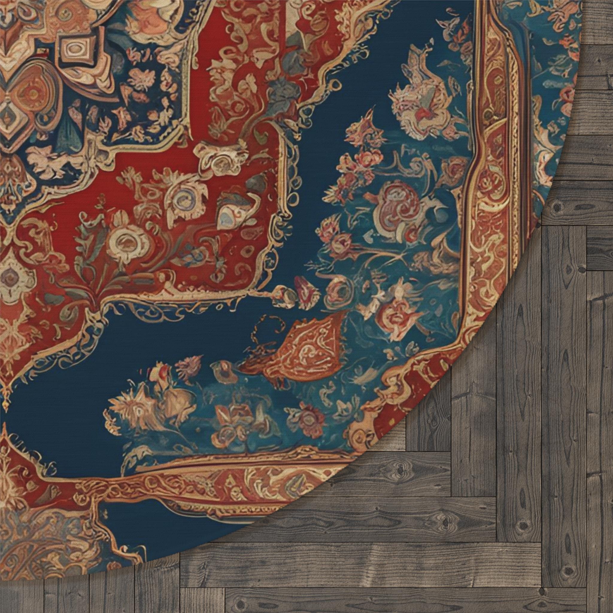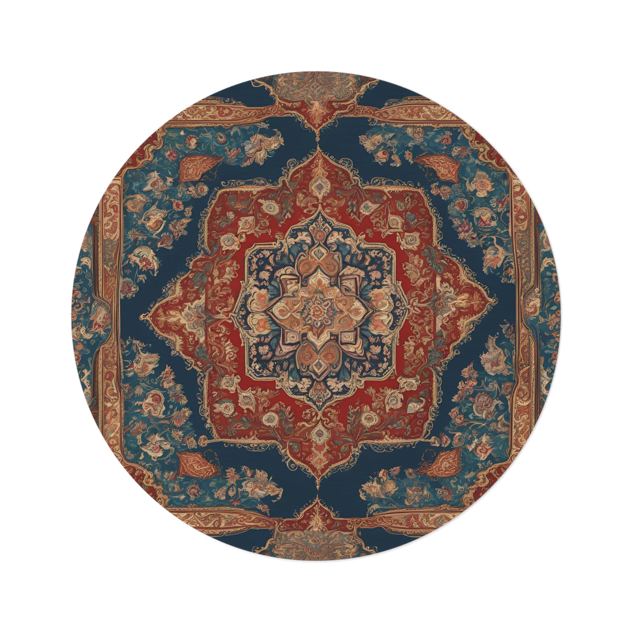 Stunning decorative rug featuring an abstract Persian rug design. This round rug brings vibrant energy to any space, showcasing intricate patterns and rich details in picture-perfect quality. Perfect for art lovers and collectors, it's a statement piece that blends culture and functionality.